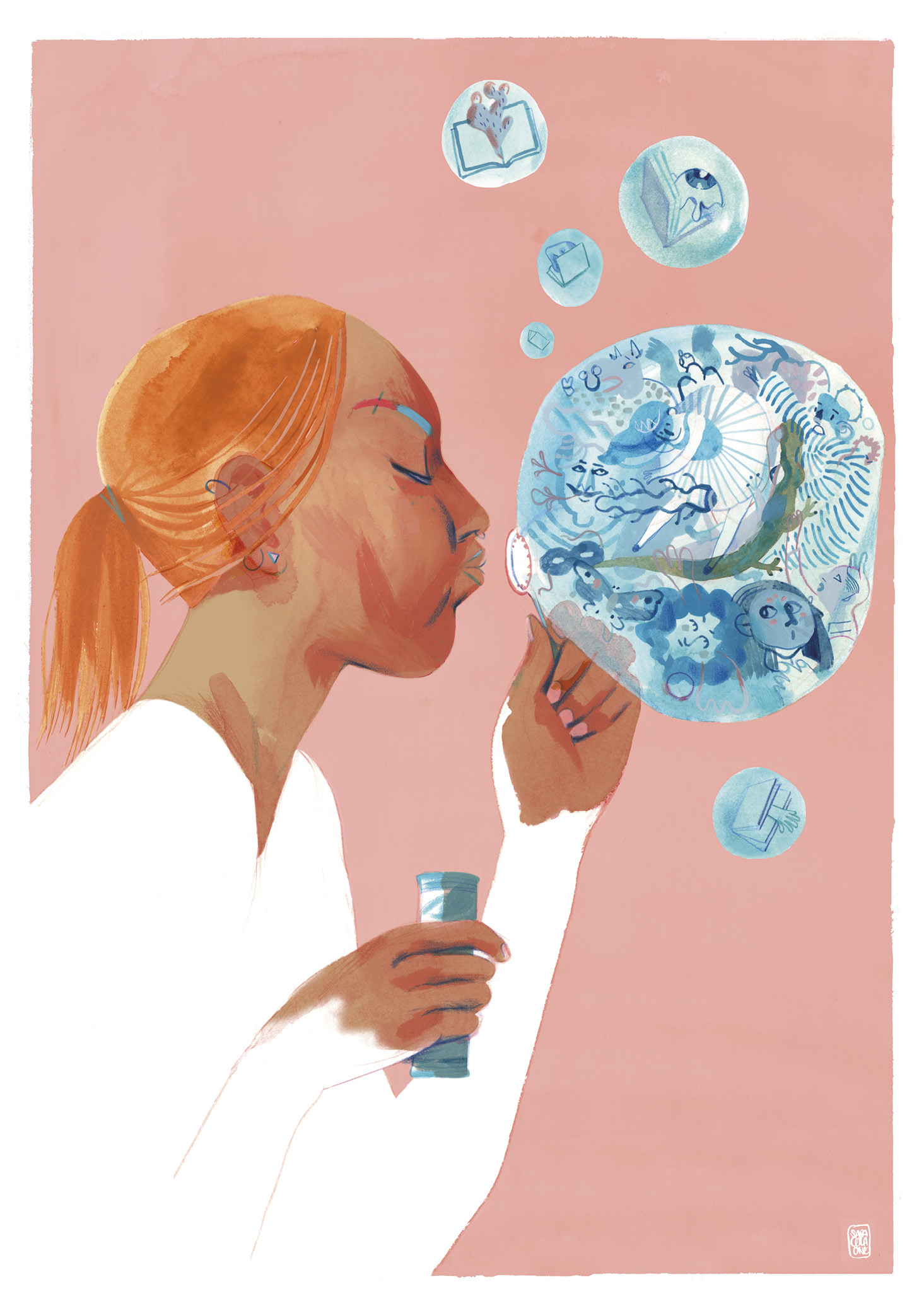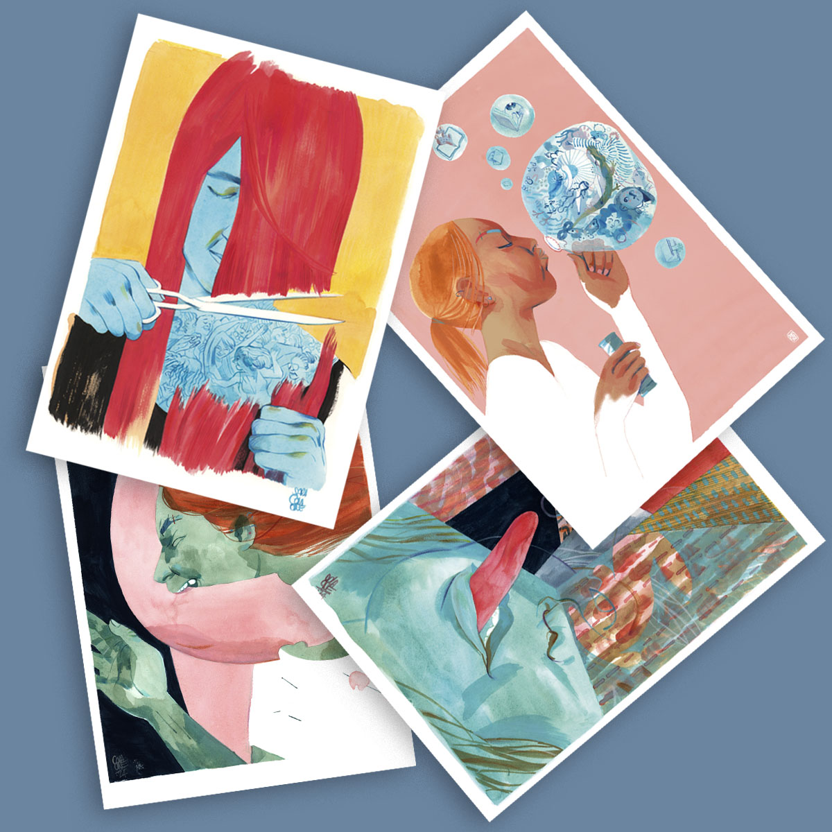 Quattro illustrazioni realizzate ad acquerello, gouache, pastelli e stampate in alta qualità su carta. Formato 31X45. Il cofanetto che le contiene è personalizzato copia per copia con la firma e con un timbro originale fatto a mano dall’autrice.